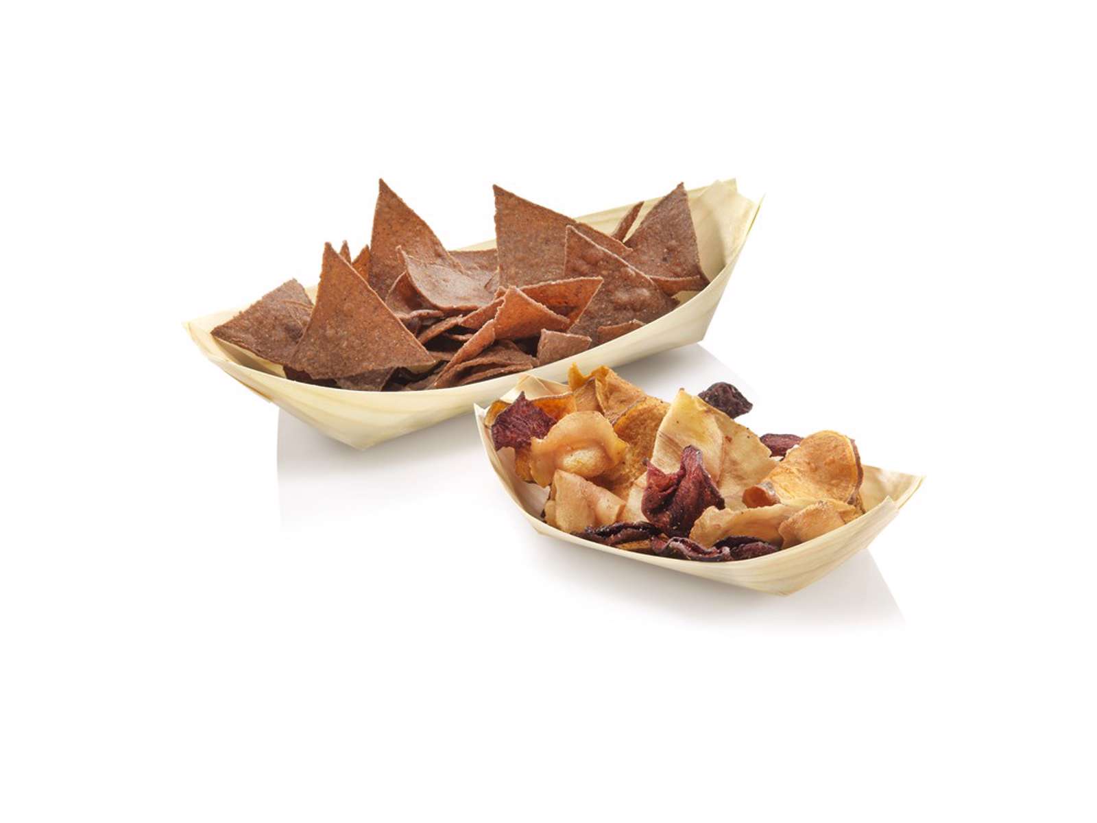 Elegant solution suitable for serving e.g. snacks, chips, tapas, nachos etc. Since the bowl is in durable; and not further processed, it is 100% biodegradable and can be composted. Not suitable for liquids. The length of the tree measures 8 cm. and sold in packs of 100.