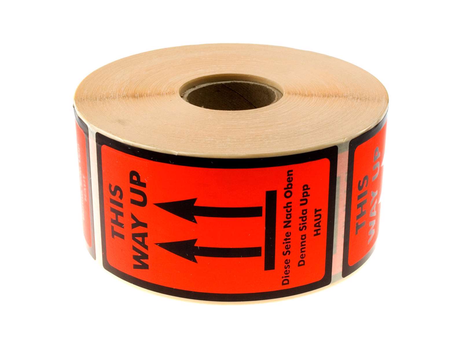 Fluorescent self-adhesive label with black print: "This Way Up" Format 120x70mm, 1000 labels per Roll.
